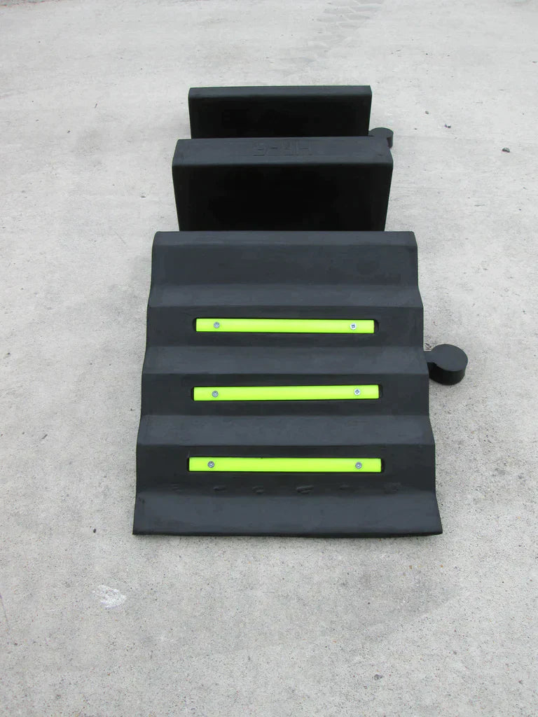 This Hose and Cable Ramp is a moulded rubber hose ramp designed to protect 2 x 125mm diameter hoses. The part has two open top channels. Each channel is 135mm at the base opening up to 140mm at the top. The depth of each channel is 120mm. Each face of the ramp has three yellow visibility strips embedded into slots.